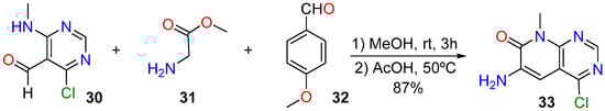 The first limitation has been recently partially solved in the synthesis of the 4-chloro substituted pyridopyrimidine 33 from the chloro substituted pyrimidine aldehyde 30 (Figure 14) []. The presence of the 4-chloro substituent allows the ulterior substitution by nitrogen nucleophiles.