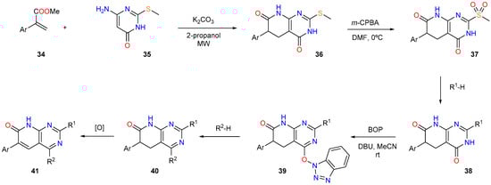 Our group has also contributed a complementary methodology that allows the synthesis of pyridopyrimidines with a wide range of substituents at C2 and C4 and two levels of unsaturation at C5-C6 (Figure 15) []. Starting from the pyrimidinone 35, the Michael addition with a 2-aryl substituted methyl acrylate (35) affords the 4-oxopyridopyrimidine 36 which undergoes oxidation to the sulfone 37 that can be substituted by different nucleophiles to yield the corresponding 38. Its reaction with benzotriazole-1-yloxytris(dimethylamino)phosphonium hexafluorophosphate (BOP) affords 39 that can be again substituted by a wide variety of nucleophiles to afford the 5,6-dihydropyrido[2,3-d]pyrimidin-7(8H)-one 40. Finally, the oxidation of 40 affords the pyrido[2,3-d]pyrimidin-7(8H)-one 41. The formation of the pyridopyrimidine structure proceeds normally with yields higher than 80%.