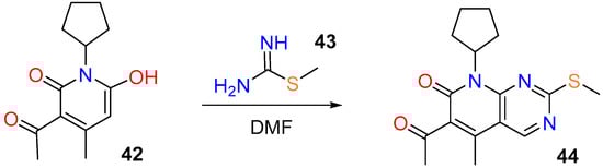 Only one example of the first kind of disconnection was found in SciFinder, the synthesis of compound 44 [], an intermediate in the synthesis of pobosaibu, from pyridone 42 upon treatment with S-methylisothiourea (43) and DMF (N,N-Dimethylformamide) which provides the C4 carbon atom (yield not available) (Figure 17).