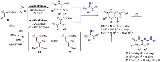 However, there are many examples of the second disconnection option shown in Figure 16. In this context, our group has a broad experience in the synthesis of 5,6-dihydropyrido[2,3-d]pyrimidin-7-(8H)-ones (50; R4 = NH2) and (51; R4 = OH) from α,β-unsaturated esters (45) (Figure 18). Thus, in the so-called cyclic strategy 2-methoxy-6-oxo-1,4,5,6-tetrahydropyridine-3-carbonitriles (47) are obtained by reaction of an α,β-unsaturated ester (45) and malononitrile (46, G = CN) in NaOMe/MeOH (usually yields are above 60% although it depends on the nature and position of the substituents at C5 and C6 [,]). Treatment of pyridones 47 with guanidine systems (49, R2 = H, alkyl) affords 4-amino-pyrido[2,3-d]pyrimidines (50, R4 = NH2) [,]. On the other hand, we described an acyclic variation of the above protocol for the synthesis of pyridopyrimidines (50, R4 = NH2) based on the isolation of the corresponding Michael adduct (48, G = CN) and later cyclization with a guanidine 49 []. Similarly, 4-oxopyrido[2,3-d]pyrimidines (here depicted as the hydroxyl tautomer 51, R3 = OH) are obtained by treating intermediates (48, G = CO2Me), the result of a Michael addition between 45 and methyl cyanoacetate (46, G = CO2Me), with guanidines 49 []. Such acyclic protocol was amenable to a multicomponent microwave-assisted cyclocondensation to afford compounds 50 and 51 via Michael adducts 48 [,]. We also achieved 4-unsubstituted 5,6-dihydropyrido[2,3-d]pyrimidines (55; R4 = H) through the Michael addition of 2-aryl substituted acrylates (45; R6 = aryl, R5 = H) and 3,3-dimethoxypropanenitrile (52) which leads, depending on the reaction temperature (60 or −78 °C, respectively), to a 4-methoxymethylene substituted 4-cyanobutyric ester (54) or to a 4-dimethoxymethyl 4-cyanobutyric ester (53). These compounds are subsequently converted to the desired 4-unsubstituted compound (55; R4 = H) upon treatment with a guanidine carbonate 49 under microwave irradiation []. We completed our approach to totally dehydrogenated pyrido[2,3-d]pyrimidin-7(8H)-ones (56–58) and (17; R4 = H) by using several oxidation protocols []. The construction of the pyridopyrimidine structure from pyridone 47 usually proceeds with yields higher than 70% but is mainly dependent on the nature and position of the substituents present in the pyridone ring.