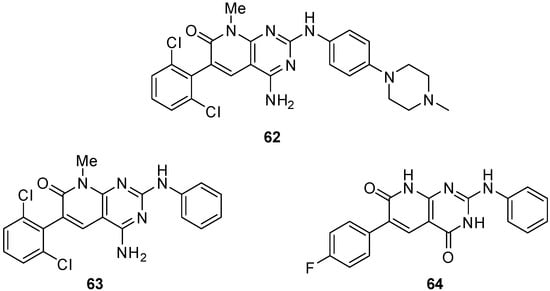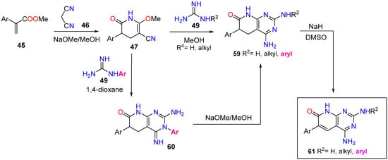 Our interest in tyrosine kinase inhibitors, led us to develop a methodology for the synthesis of 6-aryl-2-arylamino substituted 4-amino-5,6-dihydropyrido[2,3-d]pyrimidin-7(8H)-ones (59, R2 = aryl) via the corresponding 3-aryl substituted pyridopyrimidines 60, formed upon treatment of pyridones 47 with an arylsubstituted guanidine 49 in dioxane, which underwent the Dimroth rearrangement to the desired 4-aminopyridopyrimidines (59, R2 = aryl) with NaOMe/MeOH. The overall yields of such a two-step protocol are in general higher than the direct reaction between pyridones 47 and an arylsubstituted guanidine 49 (Figure 19) [].