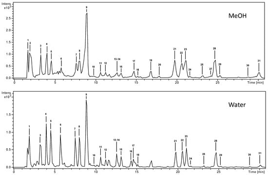 Compounds characterization was carried out by mass spectrometry, using both positive and negative ion modes. The base peak chromatograms of the methanolic and aqueous extracts of B. thunbergii leaves are shown in Figure 1 (overlapped chromatograms can be seen in Supplementary Materials). We identified or tentatively characterized 30 compounds; 50% were phenolic acids and approximately 25% flavonoids. All compounds were numbered according to their order of elution (Table 1), keeping the same numeration in both extracts. Among the identified compounds, berberine, rutin, and chlorogenic acid may be cited due to their known bioactivity.