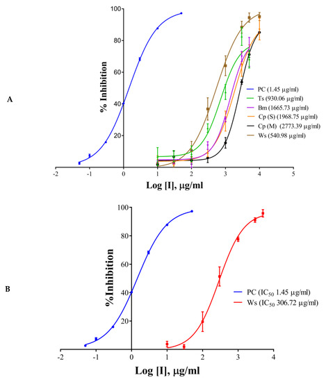 2.2. IC50 Determination of the Extracts/Components and the Positive Control
