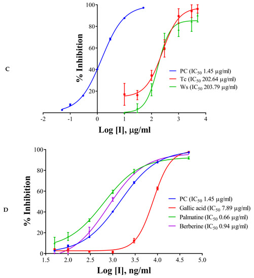 The half maximal inhibitory concentration (IC50) values of the extracts, components, and the positive control have been shown in Table 1 and Figure 2A–D. Galantamine hydrobromide showed IC50 of 1.45 µg/mL (3.95 µM). IC50 of galantamine for AChE was reported to be 0.35 µM, whereas it was 4.53 mg/mL (against AChE from electric eel) as per the report of Kaufmann et al. (2016) [28]. W. somnifera (aqueous extract) had an IC50 of 540.98 µg/mL, whereas the IC50 of T. cordifolia (aqueous extract) was 930.06 µg/mL. Other results have been shown in Table 2 and Figure 2A–C. W. somnifera (hydro-methanolic extract) showed IC50 of 306.72 µg/mL, whereas the IC50 of W. somnifera (methanolic extract) was 203.79 µg/mL. T. cordifolia (methanolic extract) performed better among all the extracts, its IC50 was 202.64 µg/mL. W. somnifera (methanolic extract) has an IC50 of 4.44 mg/mL and 124 µg/mL, as shown by Pal et al. (2017) [29] and Mathew and Subramanian (2014) [27], respectively.