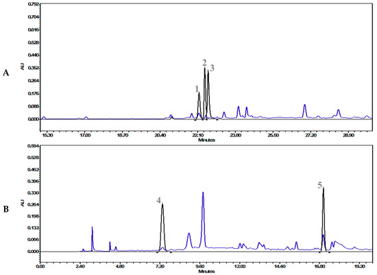 Overlap chromatographs of (A) the standard mix of ferulic acid (1, 22.16 min), palmatine (2, 22.42 min) berberine (3, 22.57 min), and T. cordifolia (Giloy)–methanolic extract at 346 nm, and (B) the standard mix of gallic acid (4, 7.35 min), vanillic acid (5, 17.03 min), and T. cordifolia (Giloy)–methanolic extract at 270 nm.