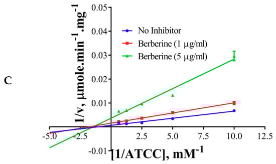 The inhibition modes of the positive control and the components were analyzed by double reciprocal Lineweaver–Burk plots. Lineweaver–Burk plots of the tool compound, galantamine hydrobromide, were fitted to be competitive (Table 3, Figure 4A). It showed increased Km (1.87 mM) and unaffected Vmax(360 U/mg), whereas the other two inhibitors, namely, palmatine and berberine, were non-competitive (Table 3, Figure 4B,C). Palmatine and berberine had unaffected Km (0.38 and 0.36 mM, respectively) and reduced Vmax (90.86 and 72.65 U/mg, respectively).