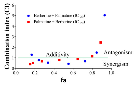 CI-fa plot of palmatine and berberine. (●) varying berberine concentration from 0.05 to 50 µg/mL and fixed palmatine concentration (IC20), (●) varying palmatine concentration from 0.05 to 50 µg/mL and fixed berberine concentration (IC20).