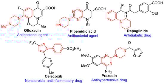 N-Arylated compounds are ubiquitous synthons in numerous natural products and functional molecules [1,2]. Particularly, their most important function is as structural fragment for FDA-approved pharmaceuticals (Figure 1), for example, antibacterial agents (Ofloxacin [3] and Pipemidic acid [4]), antidiabetic drug (Repaglinide [5]), nonsteroidal anti-inflammatory drug (Celecoxib [6]), antihypertensive drug (Prazosin [7]), etc. Although C-N bond-formation reactions between (hetero)aryl halides and N-nucleophiles are well known, including the SNAr reactions [8], classical Ullmann-type coupling reactions [9,10,11], and Buchwald-Hartwig reactions [12,13,14]. Amongst Pd-catalyzed C-N coupling reaction has been confirmed as a very useful method to build aromatic amines or arylazoles [15,16,17,18]. However, considering to the cost and toxicity of both palladium catalyst and auxiliary phosphine ligands, the arylation of N-nucleophiles with (hetero)aryl halides to form new C-N bonds still remains a significant opportunity. In recent years, Cu-catalyzed Ullmann-type couplings have attracted more and more attention due to the inexpensive catalyst and low toxicity. Although many commercially available or novel designed ligands have been developed for promoting copper-catalyzed couplings of aryl halides with N-nucleophiles, few of them are effective with less inactivated heterocyclic aryl chlorides. Besides, an easy-removal catalyst system is also very important for the environment.