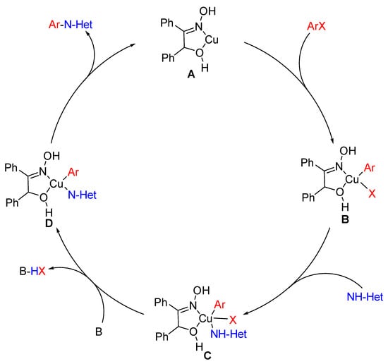The ligand BO has been reported to be used as a metal chelating agent [28], which is a typical N,O-ligand. Thus, it was believed that the Cu-catalyzed couplings could process in a homogeneous manner due to the formation of Cu-benzoinoxime complex. Herein, it was proposed that the possible mechanism for the couplings might run via a prototypical Cu (I)/Cu (III) catalytic cycle. [29] As shown in Figure 2, the catalytic cycle initiated from a Cu complex (A). Then, coordinated copper species (B) were produced via oxidative addition of an ArX and A. Ligand exchange was subsequently occurred between A and N-heterocycles to form intermediate C, which could be converted to D in the presence of base. The N-arylazole was obtained by final reductive elimination of D.
