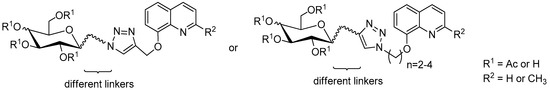 The appropriate derivatives of 8-hydoxyquinoline 3–10 (0.5 mmol) and sugar derivatives 21–24, 27–30, 33–44 (0.5 mmol) were dissolved in dry THF (5 mL) and i-PrOH (5 mL). To the obtained solution, CuSO4·5H2O (0.1 mmol, 25.0 mg) dissolved in H2O (2.5 mL) and sodium ascorbate (0.2 mmol, 39.6 mg) dissolved in H2O (2.5 mL) were added. The reaction mixture was stirred for 24 h at room temperature. The progress of the reaction was monitored on TLC in an CHCl3:CH3OH eluents system (20:1 for protected or 2:1 for unprotected compounds). After completion, the reaction mixture was concentrated in vacuo and purified using column chromatography (dry loading; toluene:AcOEt, 2:1 and CHCl3:MeOH, 100:1 for fully protected glycoconjugates or CHCl3:MeOH, gradient: 50:1 to 2:1 for glycoconjugates with unprotected sugar part) to give products 45–108.