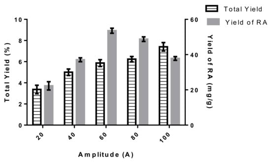Effect of amplitude on total yield and the yield of rosmarinic acid. Data were generated from three experiments (n = 3) and presented as the mean with standard deviation as error bars.