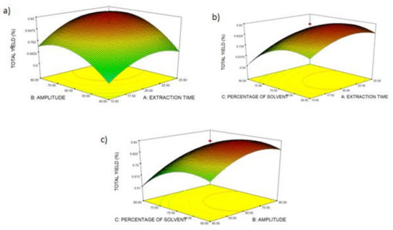 Surface plot of total yield of Orthosiphon stamineus (OS) extract: (a) extraction time and amplitude, (b) extraction time and percentage of solvent, (c) amplitude and percentage of solvent.