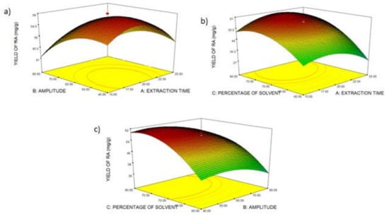Surface plot of the yield of rosmarinic acid: (a) extraction time and amplitude, (b) extraction time and percentage of solvent, (c) amplitude and percentage of solvent.