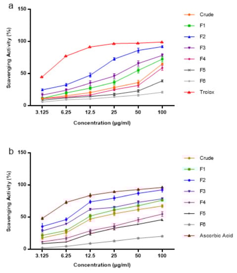 The results of ABTS and DPPH radical scavenging are shown in Table 6 and Figure 7. The radical scavenging was observed at different concentrations of 3.125 µg/mL, 6.25 µg/mL, 12.5 µg/mL, 25 µg/mL, 50 µg/mL, and 100 µg/mL, which was prepared by serial dilution. Overall, F2 was revealed to possess the best antioxidant properties, which led to more potent radical scavenging effects, mainly associated with the high content of phenolic compound. Fraction F2 was found to have the highest rosmarinic acid compared with other fractions and crude. Moreover, RA has more hydroxyl groups compared with eupatorin, TMF, and sinensetin. Pavithra et al. [54] reported that free radical scavenging activity is highly related to the availability of a hydroxyl group in the phenolic compound. The phenolic hydroxyl group is a good hydrogen donor that reacts with radical species, halting the cycle of radicals’ productions [55]. Ho et al. [56] reported that radical scavenging of OS is related to their high content of rosmarinic acid. F5 and F6 were found to have no 50% radical scavenging capacity (IC50).