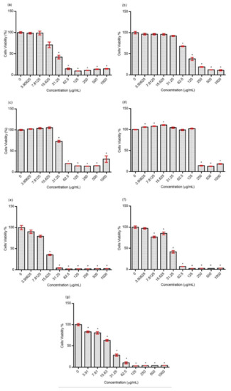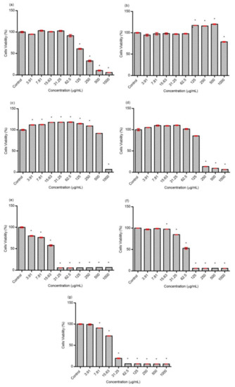 Cytotoxicity analysis of OS and its fractions on the HSF 1184 cell line after 24 h of treatment. (a) Crude extract, (b) F1, (c) F2, (d), F3, (e) F4, (f) F5, and (g) F6. The data represent the mean ± SD of three experiments. * represents significant results (p < 0.05) compared with the control (untreated HSF 1184 cells).