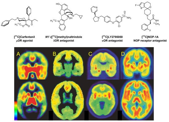 - Lohith, T.G.; Zoghbi, S.S.; Morse, C.L.; Araneta, M.F.; Barth, V.N.; Goebl, N.A.; Tauscher, J.T.; Pike, V.W.; Innis, R.B.; Fujita, M. Brain and whole-body imaging of nociceptin/orphanin FQ peptide receptor in humans using the PET Ligand 11C-NOP-1A. J. Nucl. Med. 2012, 53, 385–392. [Google Scholar] [CrossRef]