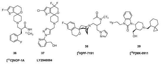 Emerging evidence supports the use of agonists for the nociceptin/orphanin FQ peptide receptor (NOP) in the clinical management of pain and for substance abuse [131], thus presenting an attractive target for molecular imgaing A series of NOP ligands based on a 2′-fluoro-4′,5′-dihydrospiro[piperidine-4,7′-thieno[2,3-c]pyran]-scaffold were screened in rats [71]. Uptake in monkey brain in a baseline condition contrasted with a blocking condition indicated specific binding of several of the [11C]-labelled compounds, of which [11C]NOP-1A ((2S)-2-[(2-fluorophenyl)methyl]- 3-(2-fluorospiro[4,5-dihydrothieno[2,3-c]pyran- 7,4′-piperidine-1′- yl)-N-methyl-propanamide (36, Figure 6) was selected for further investigations. In the synthesis developed by Pike et al. [71], [11C]NOP-1A (36) was prepared from a primary-amide type precursor by methylation with [11C]iodomethane in DMSO basified with potassium hydroxide at 80 °C for 5 min. PET imaging experiments with 36 showed a VT in monkey brain ranging from 13 mL cm−3 in cerebellum to 21 mL cm−3 in amygdala. This fell globally to 8 mL cm−3 after blocking with the antagonist SB-612111, indicating a BPND of 1–2 [132]. A somewhat lower VT range was detected in human brain [133], where the test-retest reliability was about 12% [134].
