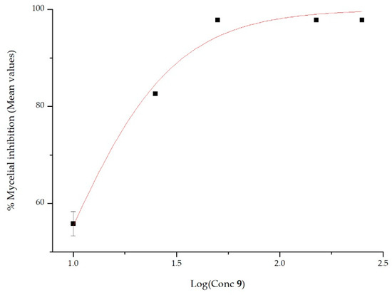 The antifungal activities of 2-AP and its derivatives against P. cinnamomi were determined by measuring mycelial growth inhibition in the absence and presence of different concentrations of all the assayed compounds. The results indicate that the inhibitory effect increases with increasing concentration and depends on the chemical structure of 2-AP derivatives. A typical measurement is shown in Figure 2 for compound 9.