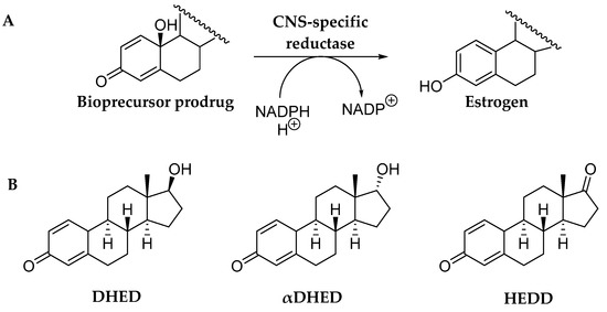 Unlike the classical prodrugs, bioprecursor prodrugs do not have auxiliary promoiety(ies) but the drug molecule itself is modified bioreversibly [36]. This type of prodrug undergoes Phase I metabolism (such as oxidation, reduction, decarboxylation, etc.) to regenerate the parent agent from the inert prodrug. One of the great advantages of bioprecursor prodrugs over classical prodrugs is that promoiety-related toxicity or innate pharmacological effects are eliminated. As mentioned previously and shown in Figure 2, our investigation on the chemical shield erected by estrogens upon capturing hydroxyl radicals led us to the recognition of estrogen-derived para-quinols that are enzymatically reduced back to the corresponding estrogens. This facile conversion, however, occurs only in the CNS (Figure 3A) rendering these para-quinols CNS-selective bioprecursor prodrugs of their parent estrogens. The chemical structures of 10β,17β-dihydroxyestra-1,4-dien-3-one (DHED), 10β,17α-dihydroxyestra-1,4-dien-3-one (αDHED), and 10β-hydroxyestra-1,4-dien-3,17-dione, (HEDD) are shown in Figure 3B as prodrugs for E2, αE2 and E1, respectively [35,36,37]. Estrogen-derived para-quinols can easily be synthesized through a one-step oxidation of the phenolic A-ring of the estrogens [48,49].