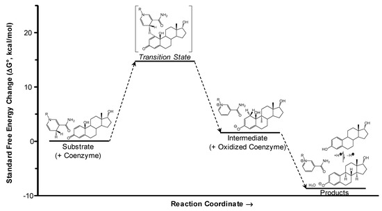 A computer-aided mechanistic study on these bioprecursor prodrugs’ reductive bioactivations to the corresponding estrogens in the CNS (Figure 3A) is shown through the example of αDHED in Figure 4 [37]. This process involves a transition state in which hydride transfer from NADPH to the C3 of the A-ring occurs, followed by water elimination and subsequent re-aromatization to αE2. The overall process is exergonic (hence spontaneous) based on the calculated standard Gibb’s free energy change (ΔG0). Thus far, DHED (Figure 3B) has been studied most extensively in preclinical animal models of E2-responsive maladies [23,36,50,51]. The unprecedented CNS selectivity of our approach in terms of prodrug bioactivation has also recently been confirmed independently from our laboratory [52,53]. We have also unambiguously shown the CNS-selective bioactivations of HEDD and αDHD to E1 and αE2, respectively [35,37].