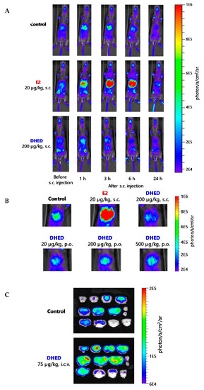 Bioluminescence imaging in repTOP ERE-Luc mice. (A) Time course analysis of in vivo bioluminescence after subcutaneous (s.c.) administrations of E2 (20 μg/kg) and DHED (200 μg/kg). (B) In vivo bioluminescense images from the hepatic area 3 h after treatment with vehicle (negative control, p.o.), E2 (20 μg/kg, s.c., positive control) and DHED (200 μg/kg s.c., as well as 20 μg/kg, 200 μg/kg and 500 μg/kg p.o.). (C) Bioluminescense in brain slices after intracerebroventricular (i.c.v.) injection of vehicle and DHED (75 µg/kg). Reproduced with permission from Reference [36]; copyright American Association for the Advancement of Science.