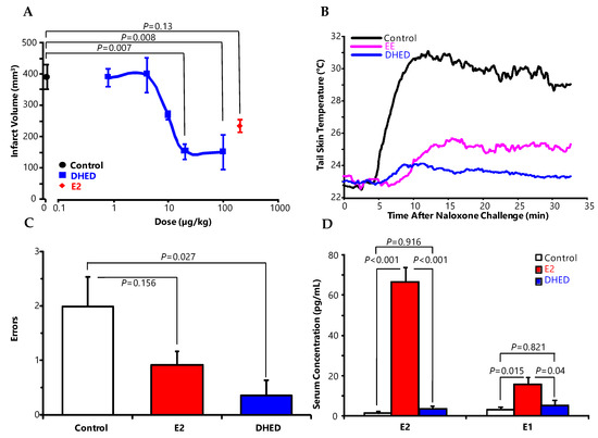 DHED also has excellent oral bioavailability, which is another important feature of our prodrug approach in the context of translational research [36]. Therefore, the clinically relevant oral route for DHED administration was successfully utilized to lower body temperature in a rodent model of menopause (Figure 6B) [23,36]. Because the parent E2 lacks appreciable oral bioavailability, the orally active synthetic estrogen, ethinyl estradiol (EE) was used as positive control in this paradigm. In another study shown in Figure 6C, continuous 7-week s.c. administration of DHED significantly decreased working memory errors committed by OVX middle-aged rats compared to control animals in a delay match-to-sample plus maze test without the increase in circulating estrogen levels (Figure 6D) and, therefore, without uterotrophic effect [36].