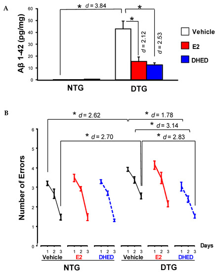 Evaluation of DHED treatment (8 weeks at 2 µg/day s.c., continuously by ALZET osmotic pumps) in males using the APPswe/PS1dE9 DTG (DTG) mouse model of AD. (A) Aβ 1–42 peptide levels in the brain of male non-transgenic (NTG) and DTG mice after treatment with vehicle, E2 (also 8 weeks at 2 µg/day s.c., continuously by ALZET osmotic pumps) and DHED; * p < 0.05 by ANOVA followed by post hoc Tukey’s honestly significant difference test, effect sizes indicated by Cohen’s d values. (B) Radial arm water maze (RAWM) results of cognitive testing. Number of errors are shown as averages for each day ± SEM (N = 7–9/group); within-group comparisons, indicating that each additional trial significantly improved response, are not displayed. DHED-treated DTG mice showed statistically significant improvement in ability to learn the task on days 1, 2 and 3 compared to vehicle-treated DTG controls, and performed like the NTG animals that manifested no behavioral impairment because they did not carry the APPswe/PS1dE9 transgene. Asterisks indicate p < 0.05 by repeated measures ANOVA followed by post hoc Tukey’s HSD test; effect sizes indicated by Cohen’s d values. Reproduced with permission from reference [51]; copyright Elsevier Inc.
