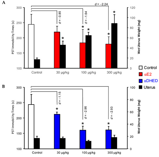 The isomeric biopecursor prodrug αDHED (Figure 3B), derived from αE2 (Figure 1), has also shown great selectivity towards the brain in terms of bioactivation to the parent drug [37]. We have utilized the well-known antidepressant effect of estrogens [11,46] to test αDHED’s ability to selectively deliver αE2 into the brain to exert this neuropharmacodynamic effect of the hormone. In the Porsolt swim test (PST), immobility time is associated with the “depressive state” [55], and PST is a useful paradigm for the initial screening for potential antidepressant agents. Here, both the direct administrations of αE2 (Figure 8A) and αDHED (Figure 8B) produced a dose-dependent reduction in immobility times, but αE2 treatment also triggered a profound uterotrophic effect (Figure 8A, black bars). However, αDHED treatment was devoid of this detrimental common side effect (Figure 8B, black bars) of current systemic estrogen therapies.
