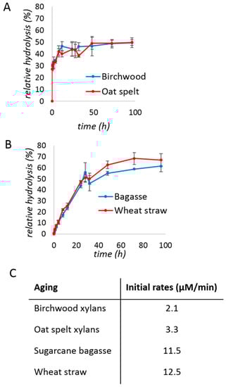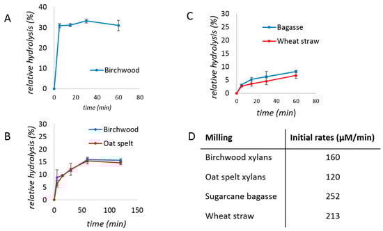 Kinetic studies of the xylanase (0.08% protein loading w/w) were performed after a brief period of milling (5 min) followed by aging, with regular sampling over time. The hydrolysis yield was approximated using the 3,5-dinitrosalicylic acid (DNS) assay [45] and plotted over time. With purified xylan substrates (Figure 1A), a typical hyperbolic behavior was obtained, reaching a plateau after ca. 20 h, at approximately 50% hydrolysis. The initial rate of the reaction was 2–3 µM/min (Figure 1C).