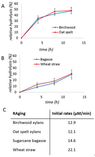 In previous studies of cellulose digestion by cellulases, it was found that RAging allowed significant improvement of both the rate and the turnover number compared to milling and aging only once [22]. The activity of xylanase (0.08% protein w/w) on xylans under RAging conditions, i.e., by repeating 12 one-hour cycles consisting of milling for 5 min and aging for 55 min, again exhibited a hyperbolic profile, with initial rates of 12–13 µM/min, and reached ca. 50% yield in 12 h (Figure 3A,C). The saccharification of biomass during RAging (Figure 3B) was also slower than when milling once and aging. Overall, these results suggest that the optimal milling regime is not universal across different enzymes.