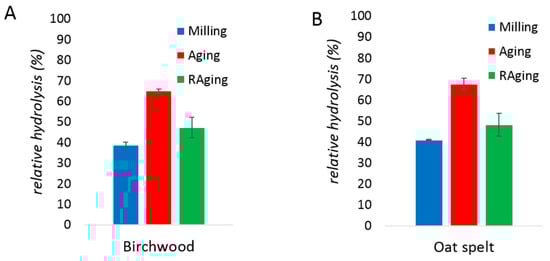 Chemical analysis of the reaction mixtures to identify the soluble products revealed that, for all substrates, milling and RAging produce mostly oligomers (Figure 6). In contrast, milling and aging only once was found to yield predominantly the xylose monosaccharide and/or disaccharide. Sugar analysis was also performed to quantify the amount of xylose monomer produced (Table S1). When compared to total reducing end yields (DNS assay), the data confirms that xylose is a minor product, although highest when milling and aging only once, with soluble oligomers being the major product in all cases. Thus, xylanase is not only more efficient under milling followed by aging, compared to either milling or RAging, but it also generates a cleaner product. This contrasts with the activity of cellulases which was found to be optimal under RAging conditions [29] and suggests that even enzymes of the same family like cellulases and xylanases, both of which are glycoside hydrolases, can have different preferences for optimal activity in the absence of bulk water.
