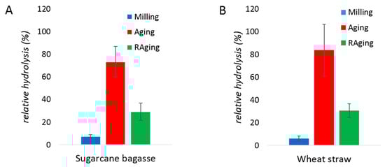 Enzymatic hydrolysis of sugarcane bagasse (A) and wheat straw (B) by xylanase after 30 min of milling (blue), 30 min of milling and 72 h of aging at 55 °C (red), or 12 h of RAging via 12 cycles of 5 min milling + 55 min aging (green) conditions. The reactions were performed at 0.13% (w/w) protein loading on 400 mg of substrate, with 600 µL of water (η = 1 µL/mg). Reactions were performed in triplicates and the error bar is the standard deviation.