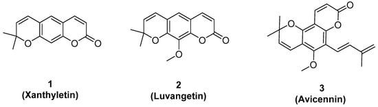 In this study, 28.0 g of bark crude extract were obtained from 120.0 g of bark, and 45.0 g of leave crude extract were obtained from 170.0 g of leaves of Z. avicennae. The extraction yields were 23.3% and 26.5%, respectively. Eight fractions (A–H) were isolated from the bark crude of Z. avicennae and four fractions (I–L) were isolated from the leave crude. By the bioassay-guided isolation method, three bioactive compounds 1, 2, and 3 were isolated from the fractions, and all compounds were identified by 1H-NMR, 13C-NMR, and HRMS spectra (see details in Supplementary Materials). Detailed analysis indicated that compounds 1–3 were xanthyletin [,], luvangetin [,], and avicennin [,], respectively, as shown in Figure 1.
