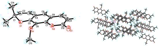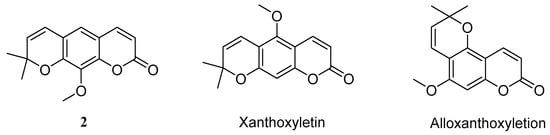 However, we found that the NMR spectra of three compounds in solvent DMSO-d6 and deuterated chloroform (CDCl3) showed apparent differences. Particularly, the difference of the 1H-NMR spectra of compounds 1 and 2 were especially remarkable. In this research, the 1H and 13C-NMR spectra of compounds 1, 2 and 3 in solvent DMSO-d6, and the differences of 1H-NMR spectra in DMSO-d6 and CDCl3 were reported for the first time, as shown in Table 1. Moreover, compound 2 had several natural isomers, such as luvangetin [,], alloxanthoxyletin [], and xanthoxyletin [,], shown in Figure 2, and the 1H-NMR spectra of these compounds were very similar. Particularly, the 1H-NMR spectrum of compound 2 in DMSO-d6 was almost consistent with the reported spectrum of xanthoxyletin in CDCl3 []. To determine the stereo structure of 2, a single crystal was prepared by slow evaporated in ethyl acetate at room temperature, and it was confirmed as luvangetin by X-ray diffraction, as shown in Figure 3.