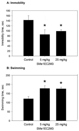 Figure 2 shows the effect of SMe1EC2M3 (5 and 25 mg/kg) on the time of immobility during the FST (A) and time of swimming in FST (B).