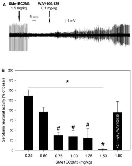 Effects of SMe1EC2M3 and WAY100135 on the excitability of 5-HT neurons of the DRN. (A): representative recording from a single neuron; (B): summary effect from seven neurons from seven rats, expressed as % ± SEM of basal activity. SMe1EC2M3 was applied at the cumulative doses of 0.25–1.5 mg/kg (i.v.). Two minutes after the last SMe1EC2M3 administration, a selective antagonist of 5-HT1A receptors, WAY100135, was injected (0.1 mg/kg, i.v.); *p < 0.05, one-way ANOVA for repeated measures; #p < 0.05, Fisher´s LSD post-hoc test.