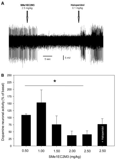 Effect of SMe1EC2M3 on the excitability of dopamine neurons of the ventral tegmental area. (A): representative recording from a single neuron; (B): summary result from seven neurons from seven rats, expressed as % ± SEM of basal activity. SMe1EC2M3 was applied at the cumulative doses of 0.5–2.5 mg/kg (i.v.). Two minutes after the last SMe1EC2M3 administration, a selective antagonist of D2 receptors, haloperidol, was injected (0.1 mg/kg, i.v.); *p < 0.05, one-way ANOVA for repeated measures.