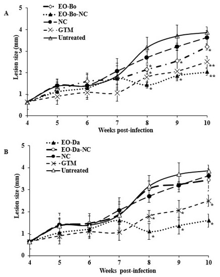 The lesion size was measured in order to follow the disease evolution. With respect to EO-Bo (Figure 1A), the administration of EO-Bo-NC resulted in a smaller lesion size (p < 0.05), which was comparable to the effects of GTM (p > 0.05). However, mice that received EO-Da-NC showed larger lesion sizes (p < 0.05) compared with EO-Da and were similar (p > 0.05) to animals treated with NC and untreated mice (Figure 1B). Additionally, after administration of EO-Bo-NC, EO-Da-NC or NC, no successful cure was exhibited, considering that no differences (p > 0.05) with respect to parasite load were displayed (Log10 = 3.33–3.93 parasite/g).