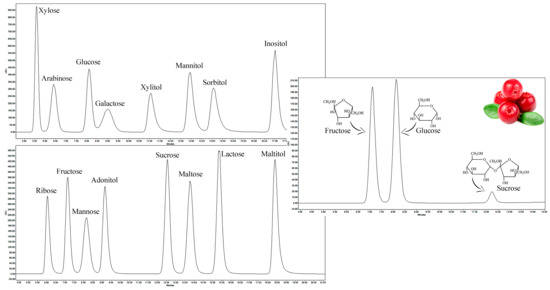 Notwithstanding the distinctions between sugar concentrations, contributions of fructose, glucose, and sucrose of total sugars were partly consistent in previous studies, and a number of reports proved that the main sugars of lingonberries are fructose and glucose. The amounts of other sugar components could appear only after hydrolysis of polysaccharide fraction. Ross et al., by using gas–liquid chromatography with FID detector, found impressively high amounts of arabinose, xylose, and galactose, and lower amounts of mannose, fucose, and rhamnose in water-extractable polysaccharides fraction from Northern Manitoba lingonberries [25]. Some of these sugars were looked at in the present study as well, but results showed that they cannot be found in lingonberries as free sugars.