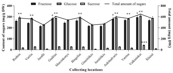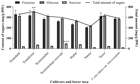 Composition of sugars in cultivated lingonberries. Bars marked with *, **, *** indicate the highest (p < 0.05) fructose, glucose, and sucrose amounts in lingonberries, respectively.