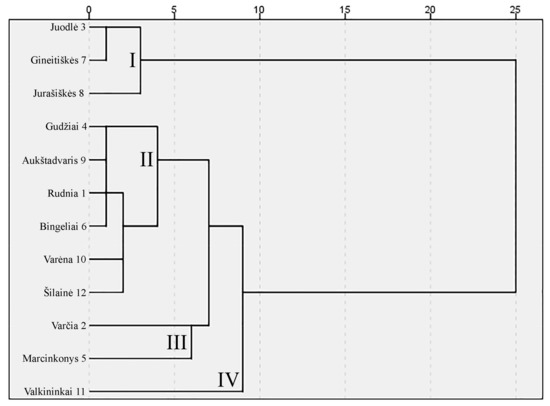 The cluster analysis divided lingonberries from different collecting locations into four clusters, which differed statistically significant from each other (Figure 3). The first cluster consisted of the lingonberries from Juodlė, Gineitiškės, and Jurašiškės forests. Lingonberries collected from these forests distinguished themselves by the lowest (p < 0.05) amounts of all types of detected sugars. Cluster two was the largest and included lingonberries from Gudžiai, Aukštadvaris, Rudnia, Bingeliai, Varėna, and Šilainė forests. Wild clones from these forests could be characterized by higher than average amounts of fructose and glucose and low amounts of sucrose. Lingonberries from Varčia and Marcinkonys forests were attributed to the third cluster. These lingonberries, on the contrary to the second cluster, accumulated lower than average amounts of fructose and glucose and high amounts of sucrose. Lingonberries from the Valkininkai forest surpassed lingonberries from other collecting locations by the highest (p < 0.05) contents of all sugars, and were attributed to the fourth cluster. These results highlight differences between wild clones of lingonberries and their adaptability to growing and environmental conditions in different locations.