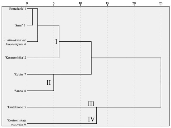After hierarchical cluster analysis, the lingonberry cultivars and lower taxa fruit samples were grouped into four significantly different clusters (Figure 5). The first cluster was distinguished by the highest amounts of total sugars, but the lowest of sucrose. The lingonberry cultivars attributed to this cluster were German cultivar ‘Erntedank’, Swedish cultivar ‘Sussi’, and Russian cultivar ‘Kostromička’. Lingonberries of Russian (‘Rubin’) and Swedish origin (‘Sanna’) accumulated the lowest amounts of fructose and glucose and were attributed to the second cluster, whereas the highest amounts of these two sugars were determined in a cultivar of German origin (‘Ertekrone’), which was attributed to the third cluster. The Russian origin ‘Kostromskaja rozovaja’ was attributed to the fourth cluster, which was characterized by the highest (p < 0.05) amount of sucrose and the lowest amount of total sugars. The results of the cluster analysis of cultivated lingonberries indicate genetic variations in the levels of sugars.