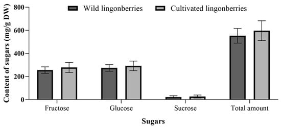 The same sugars with dominant fructose and glucose were found either in wild or cultivated lingonberries, collected at the same time—berry formation stage in 2017 (Figure 6). The average amounts of total sugars were 552.58 ± 63.57 mg/g DW in wild and 596.92 ± 85.78 mg/g DW in cultivated lingonberries. Compared with wild lingonberries, cultivated ones accumulated 1.1, 1.1, and 1.2 times higher amounts of glucose, fructose, and sucrose, respectively. Nevertheless, an independent samples t-test showed that there were no statistically significant differences between sugar amounts in the wild and cultivated lingonberries groups. Hence, domestication of lingonberries, genetical changes resulted from human selection, and also presently used constant fertilization, irrigation, and other monitored cultivation conditions had only a slight effect on the accumulation of sugars.