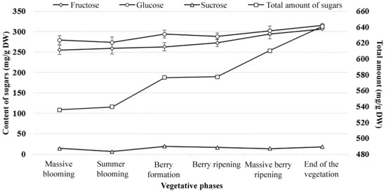 The results show that levels of sugars varied unevenly during the growing season (Figure 7). The highest (p < 0.05) amount of total sugars was found in lingonberries collected at the end of the vegetation (640.83 mg/g DW). Fructose, glucose, and sucrose levels in berries since the massive blooming stage till the end of the vegetation increased 20.23%, 18.56%, and 26.18%, respectively. Interestingly, the content of sucrose was the highest at the berry formation stage, but this content did not differ statistically significantly from the content accumulated at the end of the vegetation, and had no significant contribution to the total amount of sugars. According to the results, it is apparent that the amounts of sugars are increasing during the growing season, and lingonberries collected at the end of the vegetation are sweeter than those of the beginning of the vegetation.