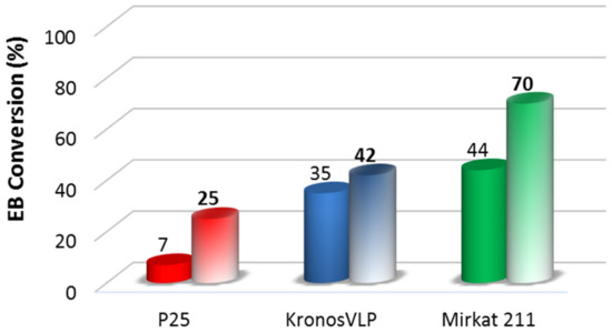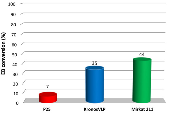 It is worth noting that the reaction here considered (EB photo-oxidation) occurs through a heterogeneous catalytic process that strongly depends on the surface area of the catalyst. The photocatalytic degradation of pollutants is based on two steps and the first one foresees the absorption of VOCs on the semiconductor surface (see Paragraph 2.2). As reported in Table 1, the BET surface area values and the pore volume obtained for Kronos VLP and Mirkat 211 commercial materials are very similar (above 200 m2/g), whilst P25 has a specific surface area of 52 m2/g and a significantly lower pore volume.