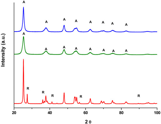 The presence of the anatase crystal phase in all the commercial catalysts was confirmed by XRD, as shown in Figure 2. Moreover, weak peaks ascribable to the rutile phase were also observed in the pattern of P25 (red line), in agreement with SEM findings. The peaks related to Kronos VLP (blue) and Mirkat 211 (green line) commercial samples are not well resolved and this feature indicates the presence of very small titania nanocrystals (according to the estimated particle sizes reported in Table 1).