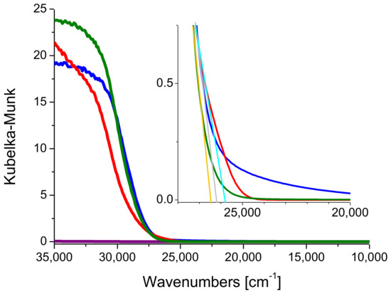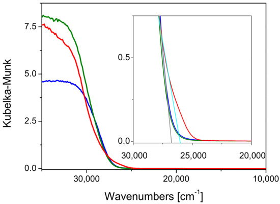 For diffuse reflectance UV–Vis-NIR analysis, powders were placed in a quartz cell. Diffuse reflectance UV–Vis-NIR spectra were run at r.t. on a Varian Cary 5000 spectrophotometer, working in the range of wavenumbers 50000–4000 cm−1. The spectra are reported in the Kubelka–Munk function [f(R∞) = (1 − R∞)2/2R∞; where R∞ represents the reflectance of an “infinitely thick” layer of the sample.