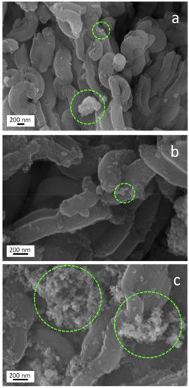 In particular, TiO2 nanoparticles (highlighted by green dashed circles) appear as bright particles of rounded shape with jagged edges. These nanoparticles seem to be better dispersed in the case of Mirkat 211- and Kronos VLP-containing samples (sections a and b). On the contrary, given the same TiO2 loading, titania nanoparticle agglomerates with bigger size were observed in the material synthesized with P25 (section c of the same Figure), indicating that P25 favors the constitution of a less dispersed material.