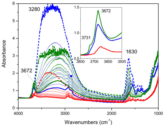 In Figure 7 the FTIR spectra collected on Mirkat 211 (green lines), Kronos VLP (black lines) and P25 (blue lines) upon outgassing from room temperature up to 200 °C are shown. Upon increasing the temperature, a gradual decrease in intensity of the broad absorption at about 3280 cm−1 as well as of the peak at 1630 cm−1, due to the presence of water, is observed in all series of spectra collected on all the bare commercial titania samples.