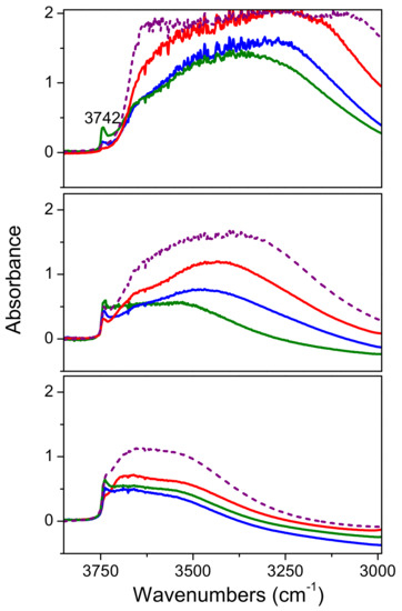The same experiments performed on the composite samples (Figure 8) revealed that if compared to the bare commercial titania samples (Figures S4–S6) the hydrophilicity of these materials resulted enhanced by the presence of the SBA-15 matrix. Moreover, the free OH groups (peak at 3742 cm−1) observed are those related to the bare silica (see the comparison with the dashed red lines in sections a-c of Figure 7). However, upon outgassing at increasing temperature, the Mirkat 211/SBA-15 sample has the highest amount of free OH groups, but the lowest amount of OH groups in interaction with water molecules (broad absorption in the 3650–3000 cm−1 range).